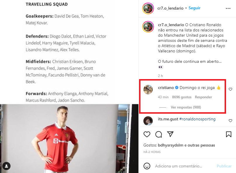 Cristiano Ronaldo, que ficou de fora dos convocados para o encontro frente ao Atlético de Madrid de amanhã, informou que vai jogar no Domingo no jogo do Manchester United frente ao Rayo Vallecano. O craque português comentou numa página de seguidores no Instagram que dava conta dos convocados para o jogo de Sábado afirmando: “Domingo o rei joga ?”.