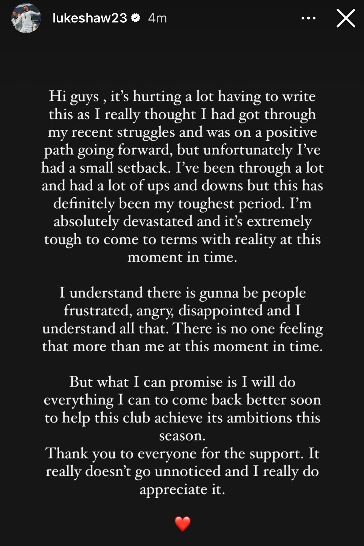 Luke Shaw, que tinha regressado recentemente de lesão, depois de ter perdido grande parte da época passada, voltou a lesionar-se e revelou estar «devastado» com mais um revés na sua carreira. «Custa-me imenso escrever isto, porque pensava que tinha ultrapassado os meus problemas recentes e estava num caminho positivo para seguir em frente, mas, infelizmente, tive um pequeno retrocesso. Tenho estado e vivido muitos altos e baixos, mas este é definitivamente o meu período mais difícil. Estou absolutamente devastado e é muito complicado encarar a realidade neste momento», começou por referir o defesa do Man Utd. «Entendo que vão existir pessoas frustradas, chateadas e desapontadas. Mas, o que posso prometer é que vou fazer tudo o que posso para voltar o mais rápido possível para ajudar este clube a alcançar as suas aspirações esta temporada. Obrigado a todos pelo apoio, não passa despercebido e agradeço muito», acrescentou o internacional inglês.