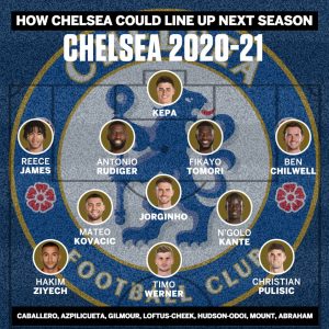 Penso que não dá sequer para lutar pelo título. Mas se os 3 de meio campo forem kante (6), kovacic (8 mais pela esquerda) e ziyech (8/10 mais pela direita) e hudson-odoi na direita, penso que a equipa será mais forte