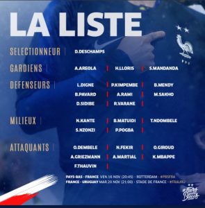 Convocados da França para os duelos com a Holanda e Uruguai: