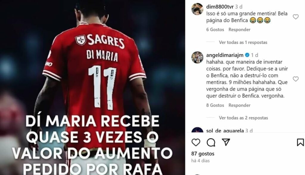Di María respondeu no Instagram a uma página de fãs do Benfica, que afirmava que o salário do argentino seria o triplo daquele exigido por Rafa para renovar, dizendo tratar-se duma invenção e acusando a referida página de querer destruir o Benfica.