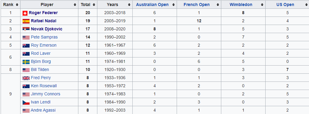 Depois dizer que Federer ganhou 10 GS numa era sem ninguém de topo é, no mínimo, engraçado quando na era em que o Djokovic ganhou mais grand slams o Federer e o Nadal estavam em baixo e o maior adversário foi Andy Murray que até chegou a ser n.º 1…