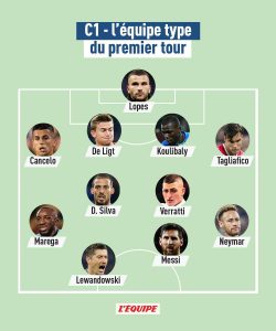 O reputado periódico francês L’Equipe revelou, esta sexta feira, o XI ideal da fase de grupos da Liga dos Campeões. Numa equipa com escolhas variadas, nota de destaque para a inclusão dos portugueses João Cancelo (brilhou, apesar de só ter participado em 3 jogos) e Anthony Lopes (voltou a estar a bom nível no jogo de quarta feira, em Kiev, depois de exibições em cheio frente ao Manchester City) e do atacante do FC Porto Moussa Marega (5 golos e 1 assistência em 6 jogos). Koulibay (Nápoles), Tagliafico (Ajax), Verratti (PSG), David Silva (Man City), Neymar (PSG), Messi (Barcelona) e Lewandowski (Bayern) completam o XI.