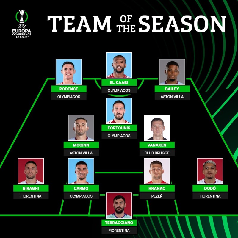 Daniel Podence e David Carmo, do Olympiacos, integram o Dream Team da Conference League. Pietro Terracciano (Fiorentina), Dodô (Fiorentina), Robin Hranác (Viktoria Plzen), Cristiano Biraghi (Fiorentina), Hans Vanaken (Club Brugge), John McGinn (Aston Villa) e Leon Bailey (Aston Villa) completam o onze eleito pela UEFA.
