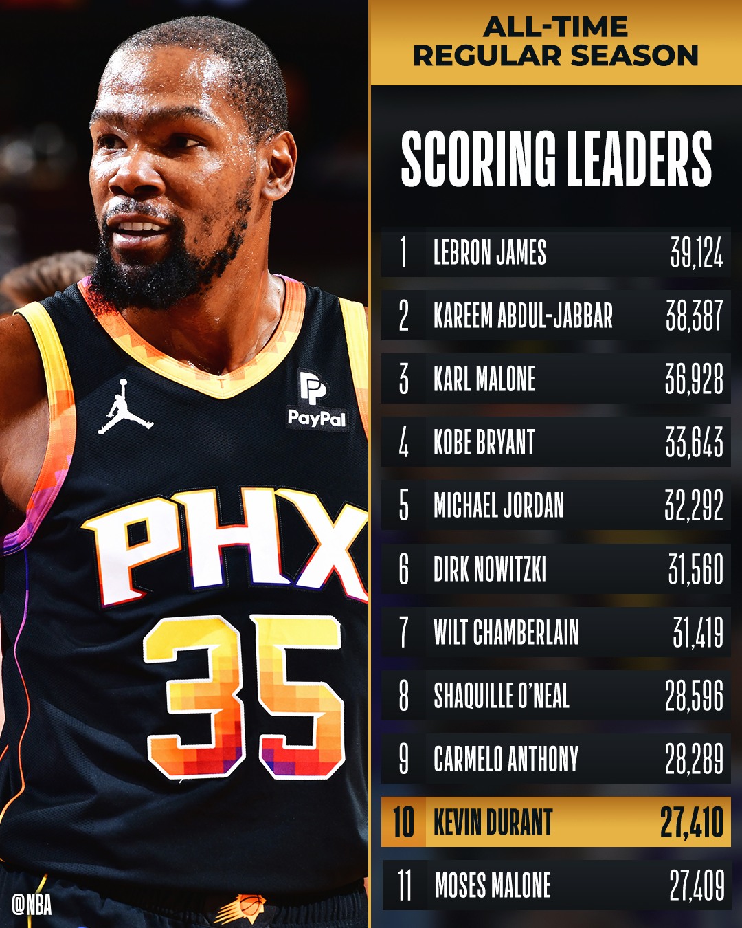 Kevin Durant, que até teve uma noite desinspirada, entrou no Top 10 dos melhores marcadores de sempre da NBA, ultrapassando Moses Malone. O craque dos Suns soma agora 27423 pontos, numa lista que é dominada por LeBron James.