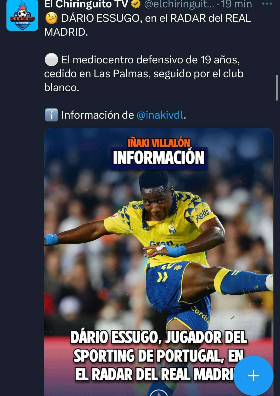 Dário Essugo tem sido quase sempre o melhor em campo nas partidas do Las Palmas, algo que não passou despercebido ao Real Madrid, que, segundo o El Chiringuito, já tem o médio de 19 anos no radar. Recorde-se que o jovem português está cedido pelo Sporting ao penúltimo classificado da La Liga, sendo que o acordo não contempla opção de compra.
