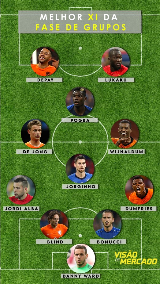 Melhor XI: Olsen, Dumfries, Bonucci, Blind, Jordi Alba, Jorginho, de Bruyne, Wijnaldum, Bale, Depay e Lukaku.