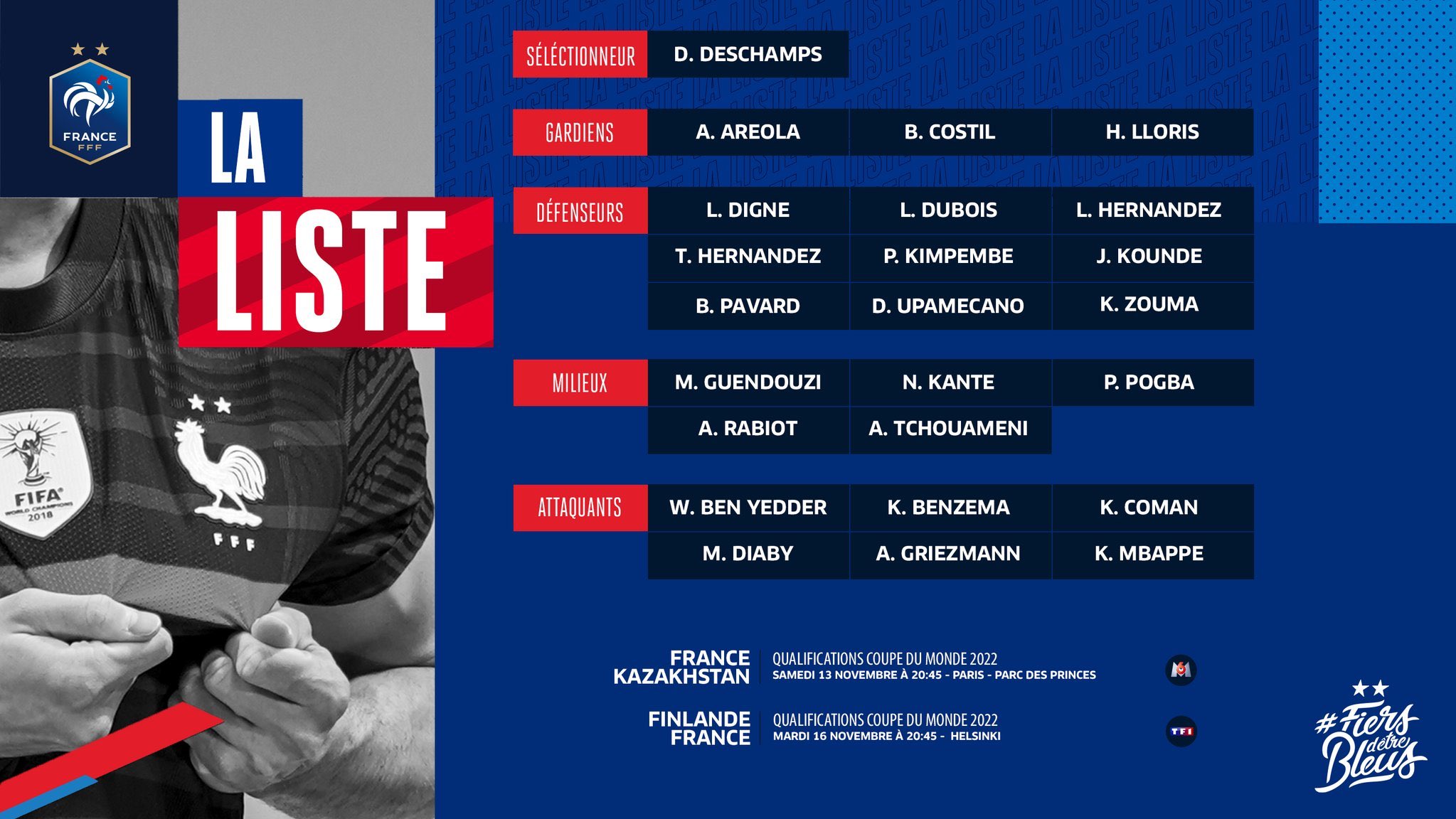 O regresso de Coman é o principal destaque na convocatória da França para os jogos com o Cazaquistão e Finlândia, de qualificação para o Mundial’2022. Já Varane, devido a lesão, é a baixa mais significativa na lista de Deschamps. Convocatória da seleção francesa: Guarda-redes: Alphonse Areola (West Ham), Benoît Costil (Bordeaux), Hugo Lloris (Tottenham); Defesas: Lucas Digne (Everton), Léo Dubois (Lyon), Lucas Hernandez (Bayern), Théo Hernandez (AC Milan), Presnel Kimpembe (PSG), Jules Koundé (Sevilla), Benjamin Pavard (Bayern), Dayot Upamecano (Bayern), Kurt Zouma (West Ham). Médios: Mattéo Guendouzi (Marseille), N’Golo Kanté (Chelsea), Paul Pogba (Manchester United), Adrien Rabiot (Juventus), Aurélien Tchouaméni (AS Monaco); Avançados: Wissam Ben Yedder (AS Monaco), Karim Benzema (Real Madrid), Kingsley Coman (Bayern), Moussa Diaby (Bayer Leverkusen), Antoine Griezmann (Atletico Madrid), Kylian Mbappé (PSG).