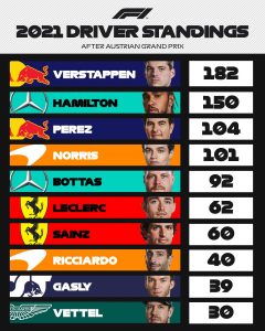 Max Verstappen venceu o Grande Prémio da Áustria, no Red Bull Ring, e está cada vez mais isolado no Mundial de F1. O holandês, da Red Bull-Honda, partiu da pole position e liderou até ao final, num dia em que Hamilton devido a danos no Mercedes não foi além do 4.º lugar, atrás de Lando Norris (3.º) e Valtteri Bottas (2.º). Verstappen tem agora 182 pontos, mais 32 que Hamilton e 78 que Pérez.