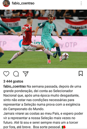 Fábio Coentrão, através de uma mensagem nas redes sociais, anunciou que não vai estar no Mundial’2018. O lateral do Sporting diz que não estar em condições para ajudar Portugal nesta fase. “Na semana passada, depois de uma grande ponderação, dei conta ao Selecionador Nacional que, após uma época muito desgastante, sinto não estar nas condições necessárias para representar a Seleção numa prova com a exigência do Campeonato do Mundo. Jamais virarei as costas ao meu País, e espero poder vir a representar a nossa Seleção mais vezes no futuro. Até lá sou e serei sempre mais um a torcer por fora, até breve. Boa sorte pessoal“, escreveu o esquerdino, que assim volta a falhar uma fase final depois de também ter ficado de fora no Euro’2016.