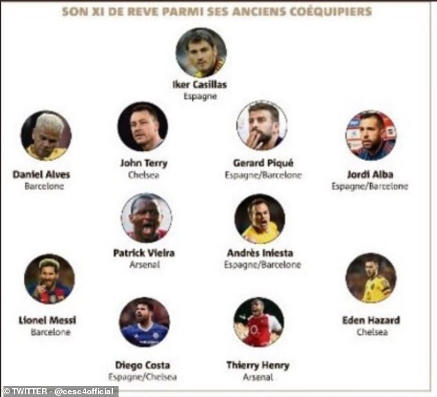Cesc Fàbregas deu a conhecer o melhor XI com quem jogou, tendo nomeado: Iker Casillas (Espanha), Dani Alves (Barcelona), Terry (Chelsea), Piqué (Barcelona e Espanha), Jordi Alba (Barcelona e Espanha), Vieira (Arsenal), Iniesta (Espanha e Barcelona), Hazard (Chelsea), Messi (Barcelona), Diego Costa (Espanha e Chelsea) e Henry (Arsenal). O médio do Mónaco, através das redes sociais, admitiu que os espanhóis Puyol e David Villa também podiam estar presentes, mas que optou ‘por variar’.