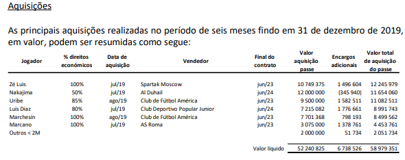 O FC Porto revelou no Relatório e Contas Consolidado do 1.º semestre de 2019/2020, os valores dos reforços para esta época. Uribe custou 11,08 ME por 80% do passe, já o regresso de Marcano obrigou a investimento de 4,45 milhões de euros. Destaque ainda para os 8,49 milhões investidos em Marchesín e nos 8,99 desembolsados por 80% do passe de Luis Díaz. Nakajima, por sua vez, como era público, custou 12 milhões de euros por 50% do passe.