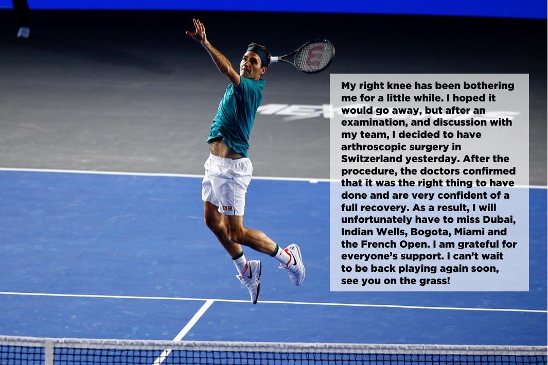 Roger Federer foi submetido a uma cirurgia e vai falhar os torneios de Dubai, Indian Wells, Bogota, Miami e ainda Roland Garros. Foi o próprio suíço a informar da paragem através das redes sociais. “O meu joelho direito já me andava a aborrecer há algum tempo. Tinha esperança de que passasse, mas depois de exames e uma discussão com a minha equipa, decidi fazer uma cirurgia artroscópica ontem na Suíça… Mal posso esperar por voltar a competir. Vemo-nos na [temporada] de relva”, escreveu o tenista suíço.