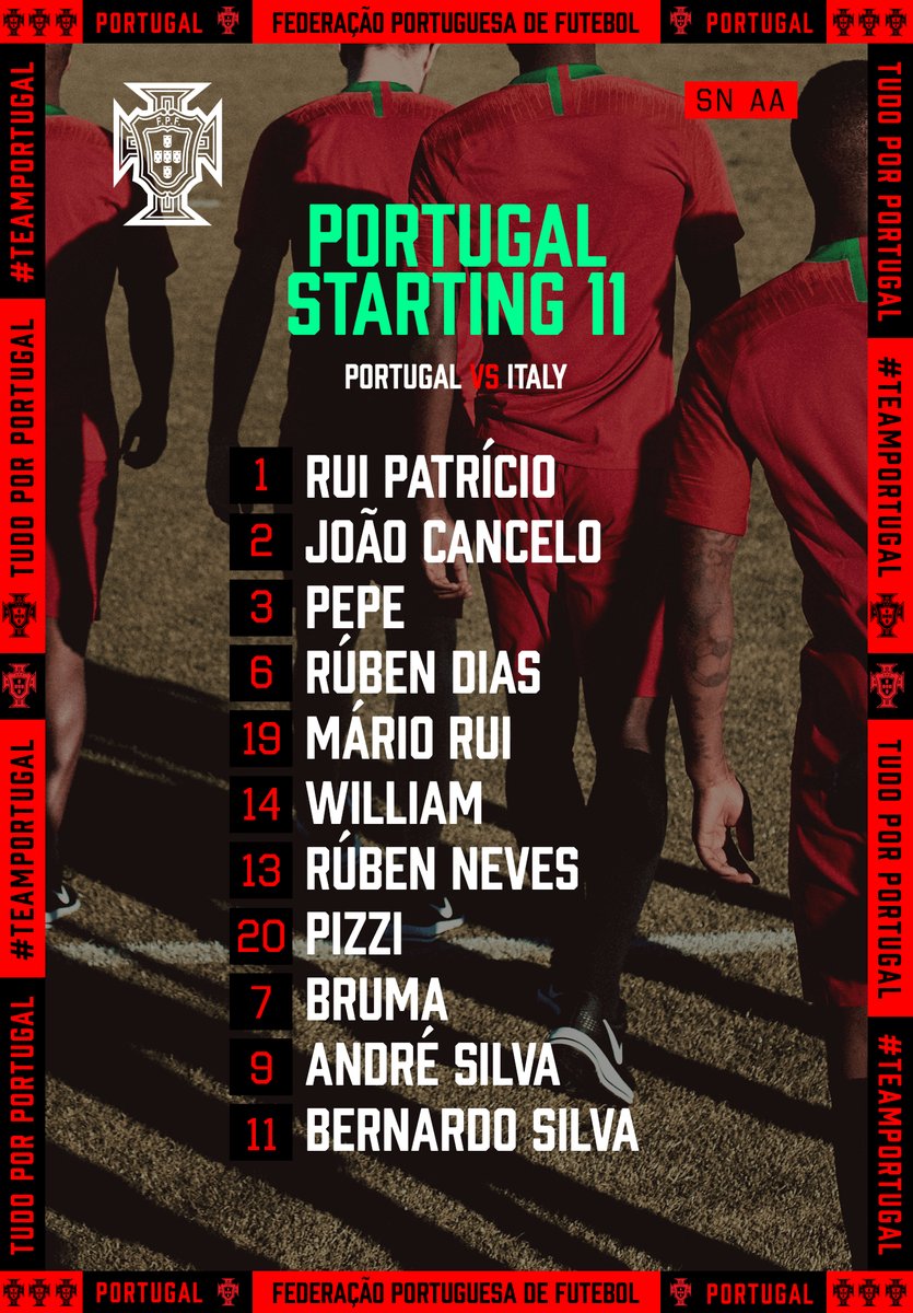 Fernando Santos vai começar frente à Itália com: Rui Patrício; João Cancelo, Pepe, Rúben Dias e Mário Rui; Ruben Neves, William Carvalho e Pizzi; Bruma, Bernardo Silva e André Silva, repetindo assim a equipa que alinhou diante da Croácia. Já Mancini tem no XI: Donnarumma; Lazzari, Caldara, Romagnoli e Criscito; Jorginho, Cristante e Bonaventura; Zaza, Chiesa e Immobile.