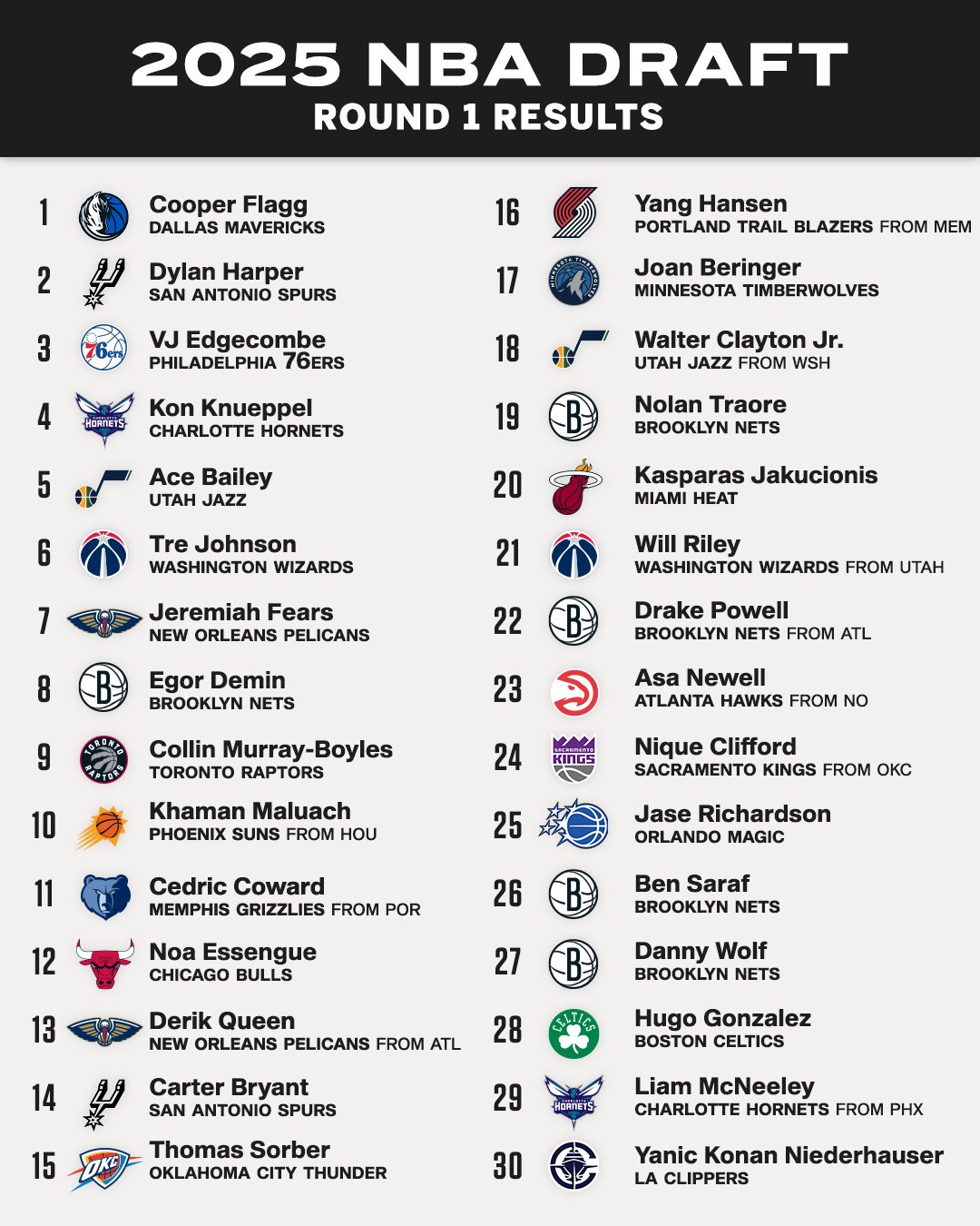 Sem surpresa, os Dallas Mavericks escolheram Cooper Flagg na 1.ª posição do Draft da NBA, O SG-SF dos Duke Blue Devils, que há muito tem o rótulo de um dos mais promissores de sempre, é assim o mais jovem a ser escolhido na 1.ª posição desde LeBron James. Já os Spurs escolheram Dylan Harper na 2.ª posição, enquanto os 76ers, como estava previsto, selecionaram VJ Edgecombe. O Draft ficou essencialmente marcado pela opção dos Jazz em escolher Ace Bailey. O SF tinha feito de tudo para não rumar aos Jazz, mas acabou por ser escolhido na mesma, sendo que nem escondeu o desagrado.