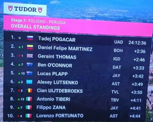 Tadej Pogacar venceu a 7.ª etapa do Giro, ao ser mais forte no CR, e tem agora menos 2’36” que Daniel Martínez e 2’46” que Geraint Thomas. O esloveno nem começou bem o CR, mas na parte final, que era mais ao seu jeito, bateu o tempo de Filippo Ganna. Destaque ainda para os australianos Ben O’Connor e Lucas Plapp, que subiram ao Top 5 da Geral.