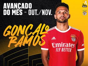 Gonçalo Ramos foi eleito o Avançado do Mês da Liga Portugal bwin nos meses de Outubro e Novembro, com 24,60% dos votos dos treinadores principais da competição. O jovem do Benfica superou as votações obtidas pelo seu companheiro de equipa Rafa, que se ficou pelos 19,05 %, e de Taremi (FC Porto), que recolheu 15,08% dos votos. Recorde-se que Ramos apontou 5 golos no período em questão.