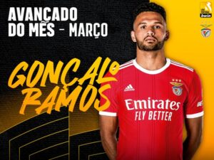 Gonçalo Ramos foi eleito o Avançado do Mês de Março na Liga Portugal bwin com um total de 42,74% dos votos dos treinadores da competição. O jovem do Benfica superou a concorrência de Rafael Mujica, do FC Arouca, que teve 18,8% dos votos, sendo que a completar o pódio ficou Iuri Medeiros, do SC Braga, com 11,11% dos votos.