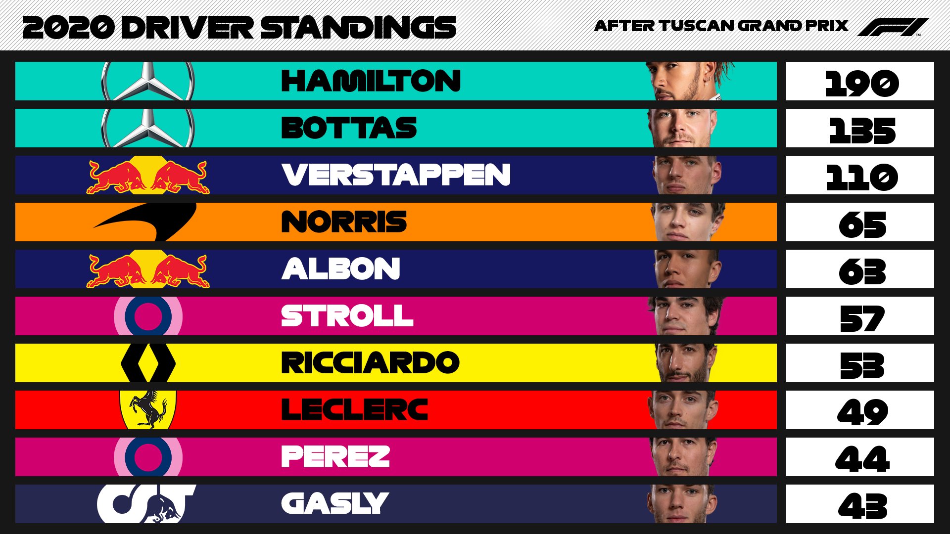 Lewis Hamilton consolidou a liderança no Mundial de F1 ao vencer o GP da Toscânia. O inglês, que já leva 90 vitórias na carreira, ainda perdeu a liderança para Bottas depois de partir na pole, mas no 2.º arranque (a prova foi interrompida duas vezes devido a acidentes) chegou ao 1.º lugar, que segurou até ao fim. Valtteri Bottas e Alexander Albon completaram o pódio, numa corrida que ficou marcado pelos abandonos de Gasly e Verstappen logo a abrir.