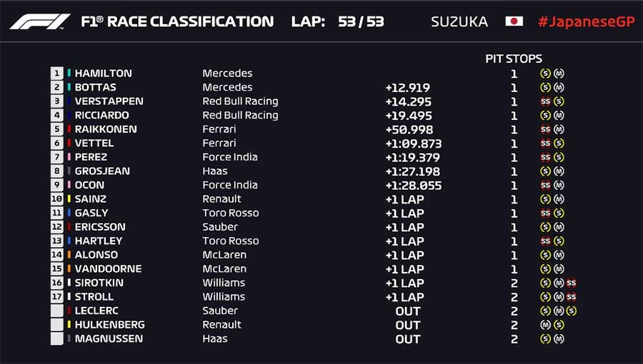 Lewis Hamilton venceu o GP do Japão depois de ter dominado no principio ao fim, e consolidou ainda mais a liderança no Mundial de F1. O inglês, que largou da 1.ª posição (foi a 80.ª pole na carreira), nunca foi incomodado e ainda viu Vettel, que teve mais um GP atribulado, terminar em 6.º. O alemão, que na qualificação ficou apenas em 9.º, ainda esteve a circular em 4.º, mas um toque em Verstappen fez com que caísse para o 10.º lugar. Recuperou até ao 6.º, mas já está a 67 pontos de Hamilton. Bottas fez 2.º, enquanto Verstappen completou o pódio.