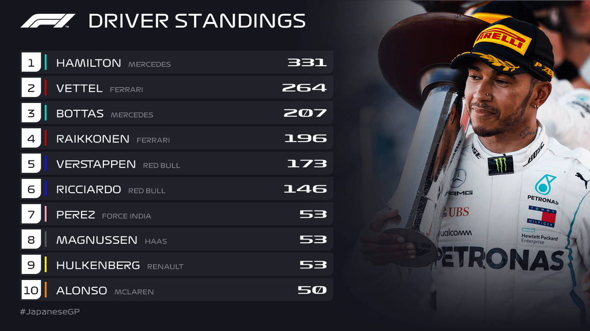 71.ª vitória na carreira para o inglês, 9.ª esta época, sendo que está numa série de 4 consecutivas (6 nos últimos 7 GP). Agora a dúvida é perceber se festeja já nos EUA (‘basta’ ganhar e Vettel não ir além do 3.º lugar) ou no México.