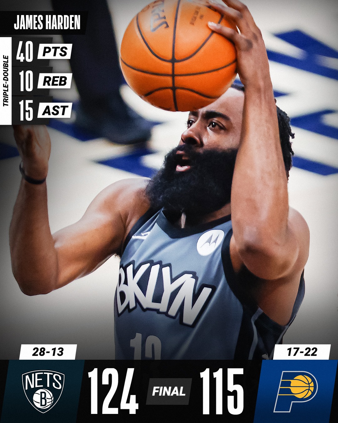 James Harden somou mais uma exibição do outro Mundo ao juntar 40 pontos a 10 ressaltos e 15 assistências na vitória dos Nets frente aos Pacers, por 124-115. Foi o 3.º jogo que conseguiu pelo menos 30 pontos e 15 assistências, algo que nunca tinha acontecido na história de Brooklyn, que não contou com Irving e Durant para este encontro. Nos outros jogos da noite, destaque para os 42 pontos de Doncic no triunfo dos Mavs contra os Clippers por 105-89.