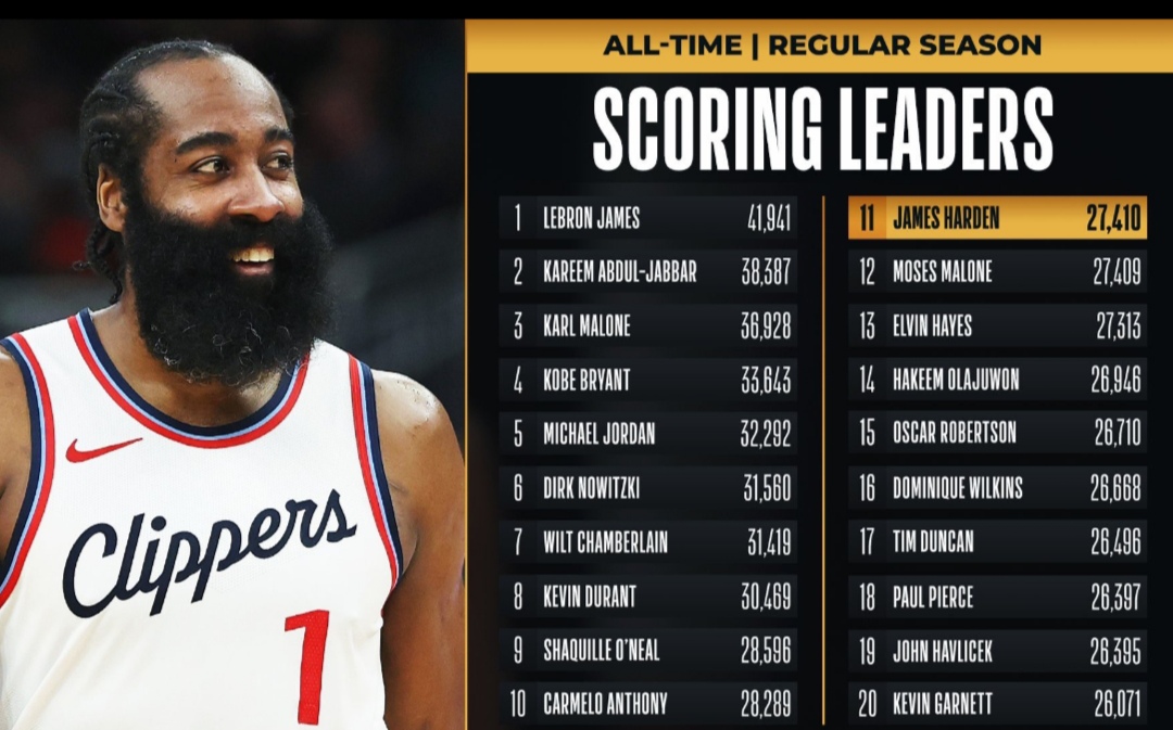 James Harden marcou 17 pontos na derrota dos Clippers sobre os Thunder (101-103), registo que lhe permite ultrapassar Moses Malone na lista dos melhores marcadores de sempre da NBA. O SG norte-americano soma agora 27416 pontos e está a menos de mil de ultrapassar Carmelo Anthony.