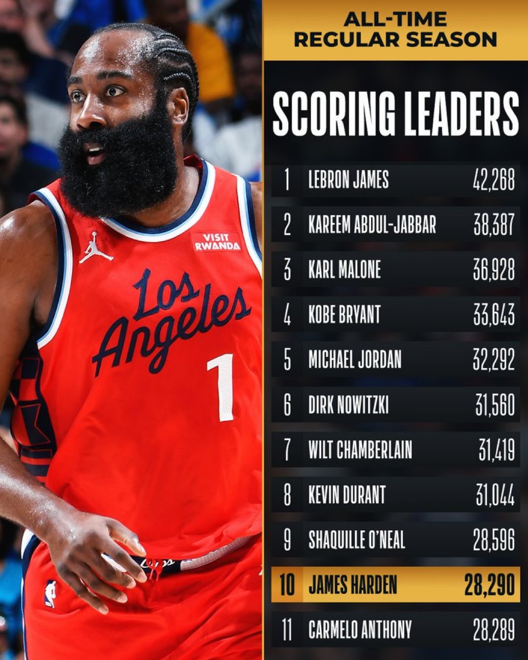 James Harden entrou no Top 10 de melhores marcadores na história da fase regular da NBA. O base dos Clippers chegou aos 28303 pontos e superou Carmelo Anthony, que era o 10.º com 28289. O ‘barbas’ inclusive está perto de ultrapassar Shaquille O’Neal.