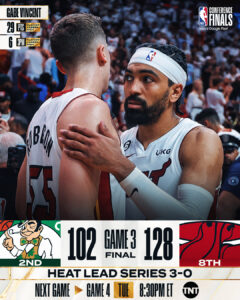 Os Heat fizeram o 3-0 na final da Conferência Este ao cilindrarem os Celtics (128-102). Miami foi para o intervalo a vencer por 15 e terminou o 3.º período a liderar por 93-63. Butler, que teve algum descanso, desta vez só marcou 16 pontos e Adebayo 13, no entanto foi a noite dos Undrafted, com Caleb Martin a apontar 18, Gabe Vincent 29 e Duncan Robinson 22. Na equipa de Boston foi uma noite terrível para todos. Tatum só conseguiu 14 pontos, Brown 12 e o resto dos titulares nem passou dos 9.