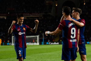 O Barcelona conseguiu uma incrível reviravolta e derrotou o Celta de Vigo, em casa, por 3-2. Os Blaugrana aos 81′ perdiam por 2-0, mas uma ponta final surreal, e com grande contributo português, permitiu somar a 6.ª vitória consecutiva. Larsen e Douvikas marcaram para os galegos, mas Lewandowski bisou, com assistências de Félix (que classe) e Cancelo, tendo o ex-Man City carimbado a reviravolta no marcador em cima dos 90.