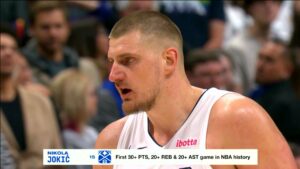 Nikola Jokic voltou a fazer história ao somar 31 pontos, 21 ressaltos e 22 assistências na vitória dos Nuggets contra os Knicks, por 149-141. O sérvio tornou-se assim no 1.º jogador de sempre a somar um 30-20-20 na NBA. Jokic também passou a ser o Center com mais assistências num jogo, superando Wilt Chamberlain, que tinha o recorde desde os anos 60.