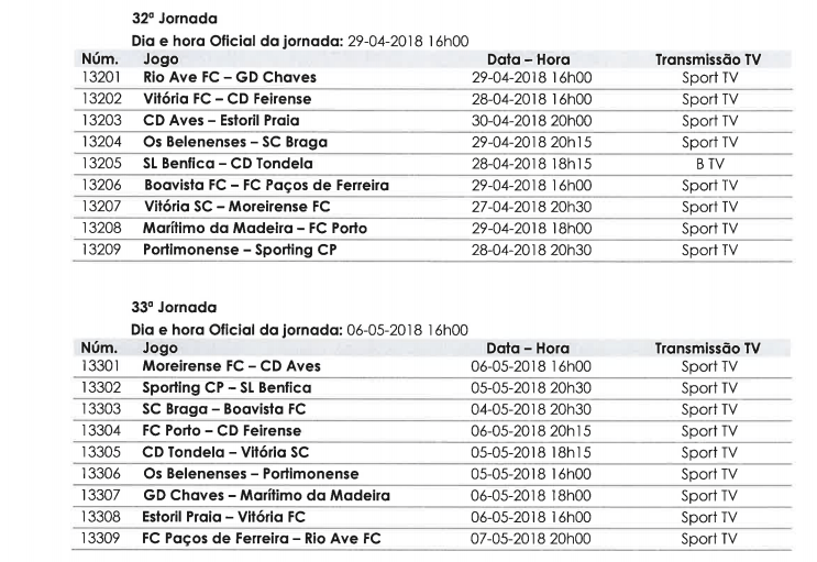 O dérbi entre Sporting e Benfica, da 33.ª jornada, vai ser jogado sábado, dia 5 de maio, às 20h30. A Liga comunicou hoje o calendário das jornadas 32 e 33, sendo que na 32.ª o Benfica recebe o Tondela no 28 às 18h15. Nesse dia, às 20h30 o Sporting desloca-se ao terreno do Portimomense. Já o FC Porto actua na Madeira frente ao Marítimo no dia 29. Na 33.ª o FC Porto mede forças com o Feirense um dia depois do duelo entre Sporting e Benfica.