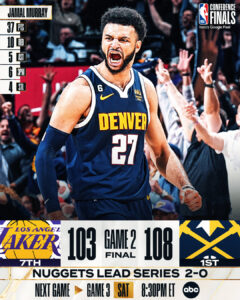 Os Nuggets fizeram o 2-0 na final da Conferência Oeste da NBA ao baterem os Lakers, por 108-103. Jamal Murray, que no final da partida mandou a farpa aos comentadores, por falarem apenas na equipa de LA, brilhou com 37 pontos, 23 deles no último período, tendo ainda somado mais 10 ressaltos. Também Jokic manteve o seu nível com 23 pontos, 17 ressaltos e 12 assistências. Já os Lakers, que chegaram a ter uma vantagem superior a 12 pontos, tiveram um Rui Hachimura em grande (21 pontos), no entanto LeBron (0-6 nos triplos) não passou dos 22 pontos e AD só marcou 18.