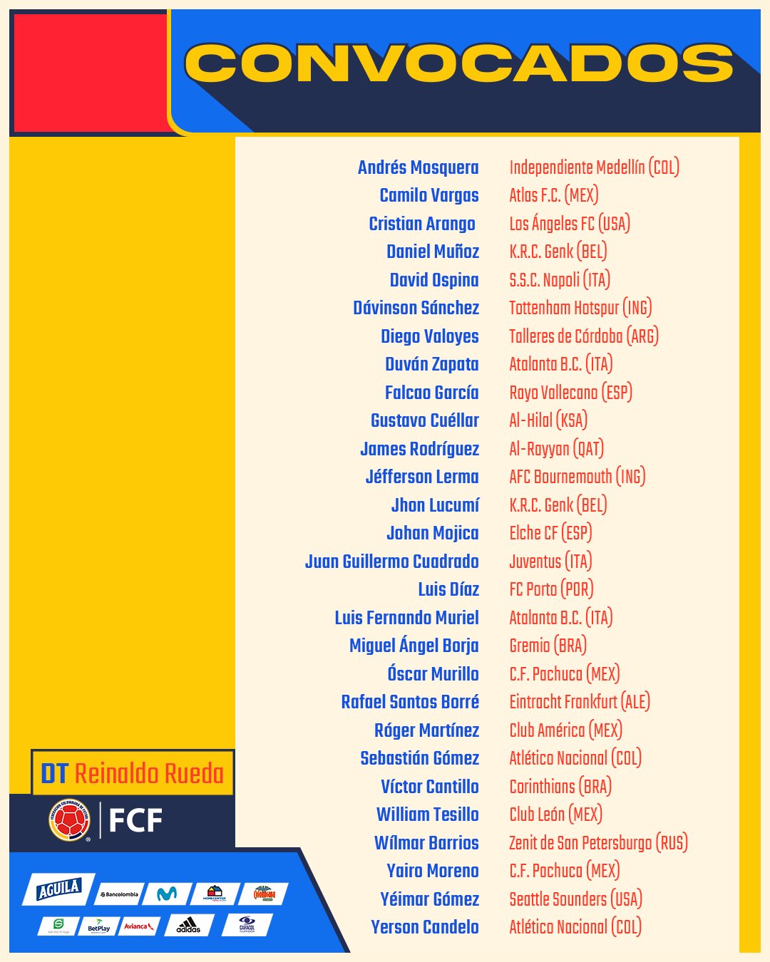 James Rodríguez, que não era chamado desde novembro de 2020, num jogo em que os cafeteros perderam por 6-1 com o Equador, é a principal novidade na lista de convocados da Colômbia para os jogos frente ao Brasil e o Paraguai, referente à qualificação para o Mundial’2022. O portista Luis Díaz também está na lista de Rueda, já Matheus Uribe, que saiu lesionado contra o Boavista, ficou de fora.