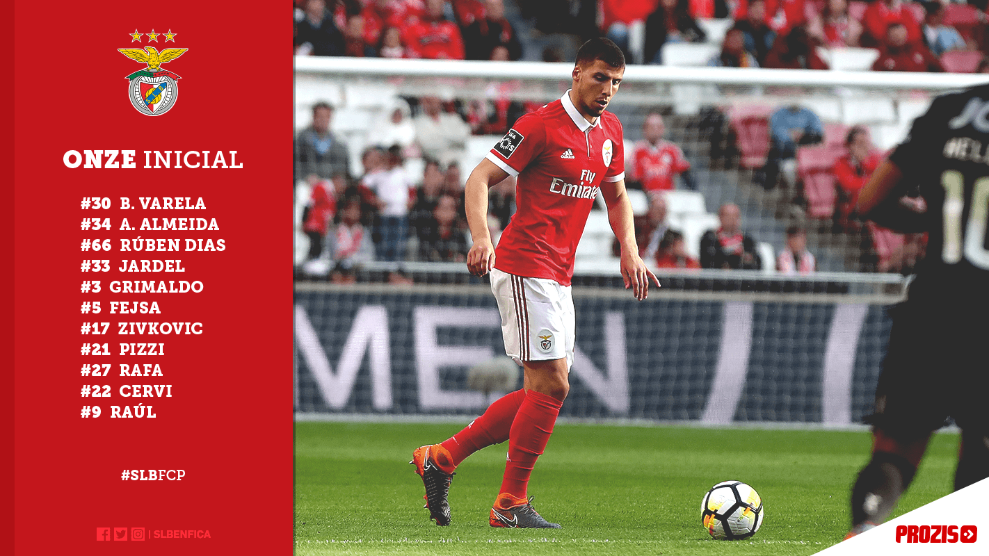 Rui Vitória vai alinhar frente ao FC Porto com: Bruno Varela, André Almeida, Rúben Dias, Jardel, Grimaldo, Fejsa, Pizzi, Zivkovic, Rafa, Raúl Jiménez e Cervi. As águias repetem assim o XI que começou a partida em Setúbal. Já Jonas nem se vai sentar no banco. Suplentes dos encarnados: Svilar, Luisão, Eliseu, Samaris, Salvio, João Carvalho e Seferovic.