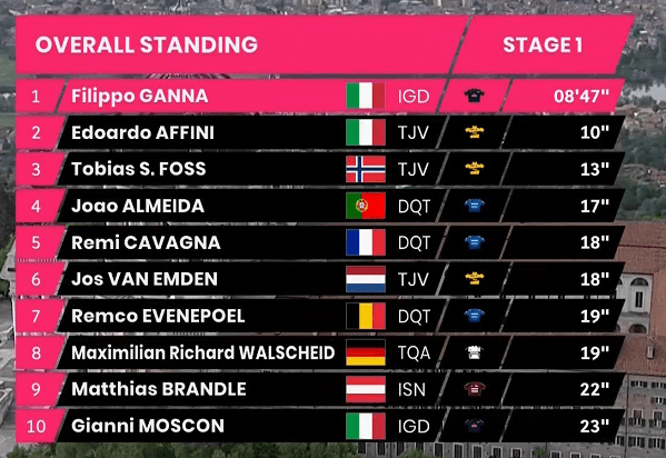 João Almeida fez 4.º no CR que abriu o Giro’2021. O jovem português, que já em 2020 tinha começado em grande, só foi batido por Foss, Affini e pelo favorito Filippo Ganna, que é assim o 1.º camisola rosa nesta edição. Já Nélson Oliveira (esperava-se que fizesse pelo menos Top 10) foi 16.º, enquanto Rúben Guerreiro terminou na 74.ª posição.