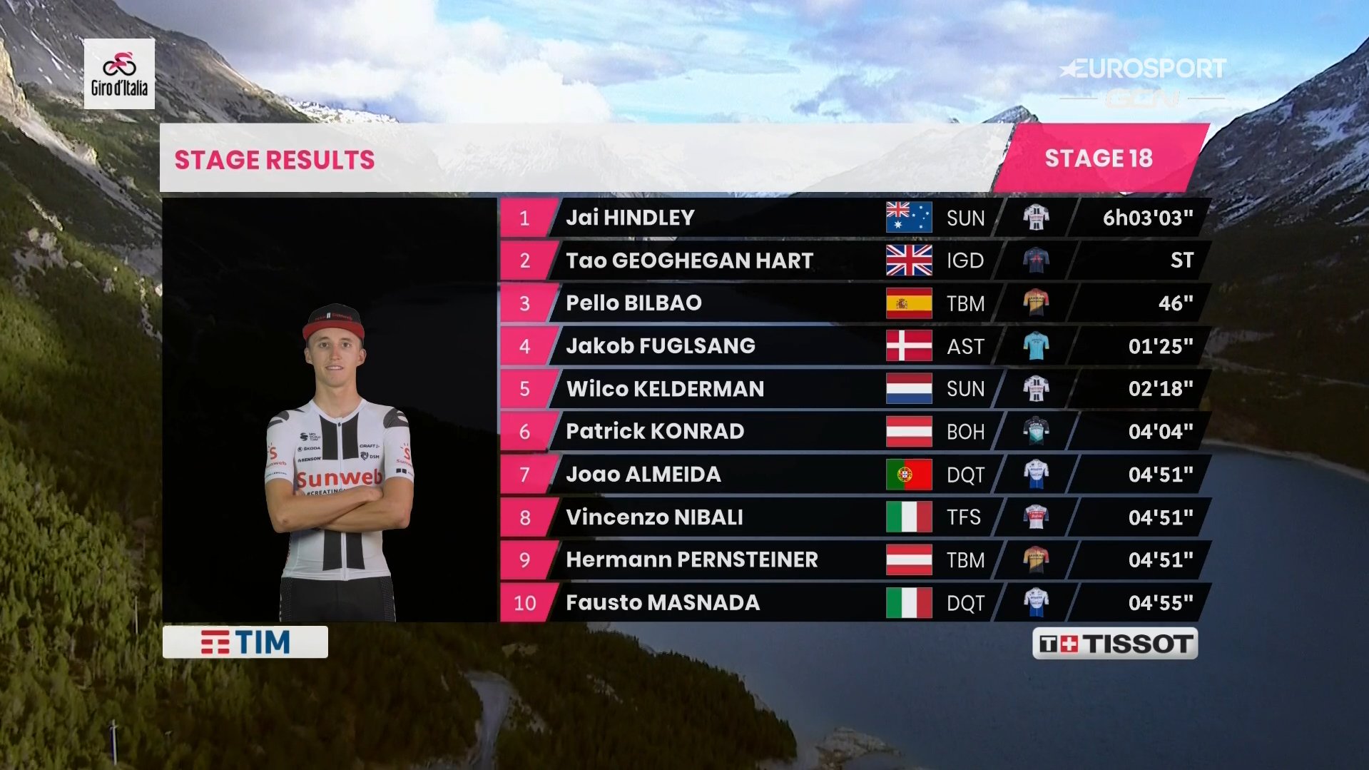 Jai Hindley venceu a 18.ª etapa do Giro num dia em que João Almeida perdeu a rosa para Wilco Kelderman. O português cedeu logo na fase inicial do Stelvio, numa fase em que a Sunweb e a INEOS colocaram um ritmo forte, mas ainda minimizou os estragos ao fazer um 7.º lugar que lhe permite continuar assim na luta pelo Top 5. Quanto à discussão da etapa, Dennis, Tao Geoghegan Hart, Hindley e Kelderman destacaram-se no Stelvio, mas o holandês acabou por ceder, e até pareceu tirar o pé a determinada altura pela falta de solidariedade da Sunweb, que não fez recuar Hindley, no entanto o 4.º lugar na etapa permitiu-lhe chegar à rosa. Já Hindley, que bateu Geoghegan Hart ao sprint na chegada a Laghi di Cancano, está agora apenas 12 segundos do líder, sendo que Hart é 3.º a 15 segundos. Almeida, por sua vez, desceu para o 5.º lugar a 2’16” da rosa.