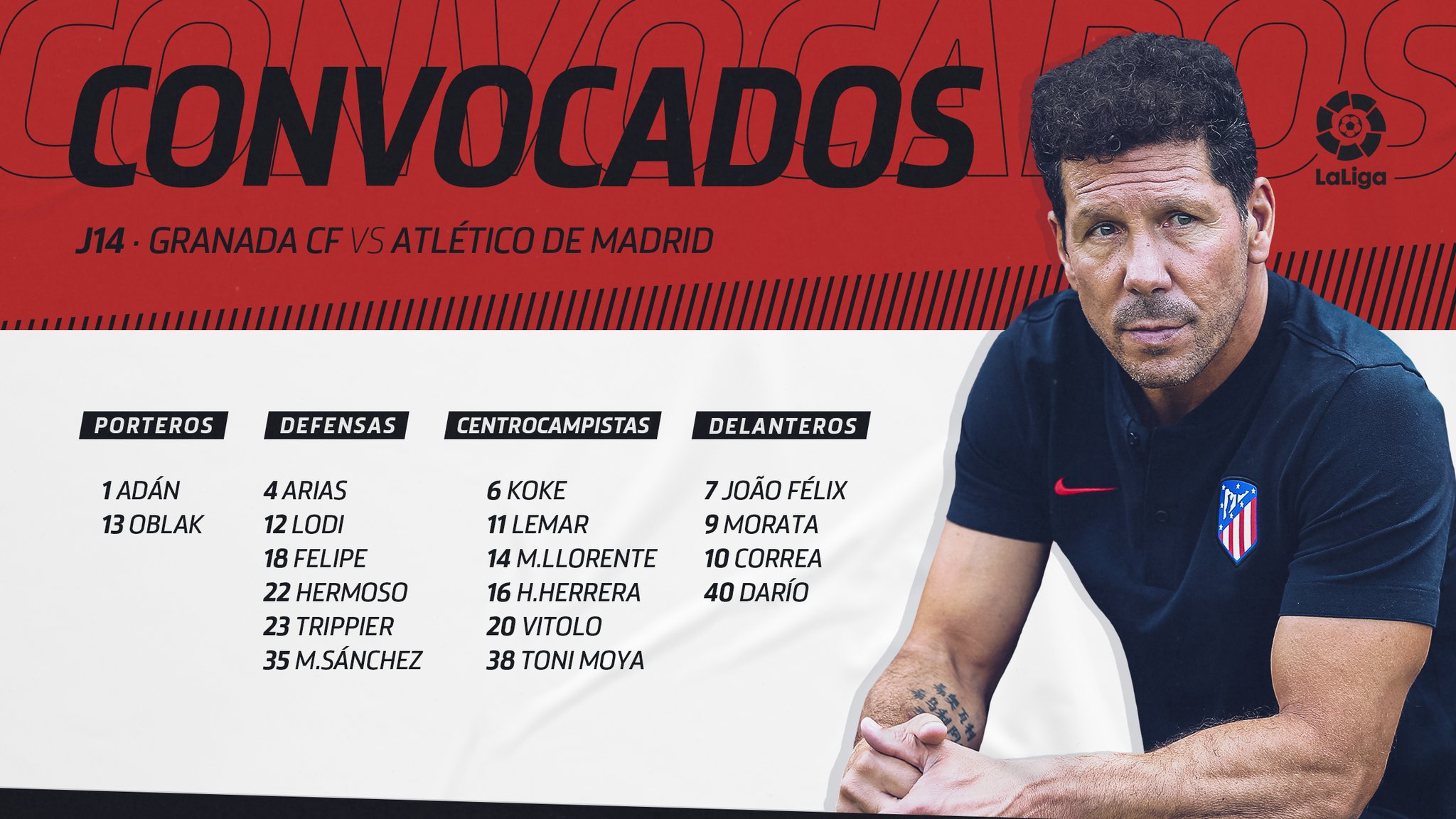 João Félix integra os convocados do Atlético para a deslocação ao terreno do Granada. O avançado, internacional português, estava parado desde 19 de Outubro, quando se lesionou frente ao Valencia. Apesar do regresso às convocatórias é provável que comece o jogo no banco, já que em Espanha adiantam que Morata, Vitolo e Correa devem formar o ataque de Simeone.