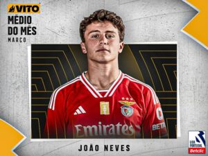 João Neves foi eleito o melhor médio da Liga no mês de Março, com um total de 29,06% dos votos. O jovem do Benfica, que foi distinguido pela quinta vez esta temporada, superou Hjulmand (Sporting CP), que teve 21,37% dos votos, enquanto David Simão (FC Arouca) completou o pódio com 7,69% das preferências.