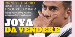 A Gazzetta dello Sport faz manchete com Paulo Dybala, afirmando que o craque argentino foi colocado à venda pela Juventus. Apesar do golo ao Nápoles, a Vecchia Signora está decidida a abdicar de La Joya, que tem contrato até 2022, sendo que o jornal italiano fala ainda de um alegado braço de ferro entre o jogador e o clube. A Vecchia Signora pretende evitar que o ’10’ saia a custo zero, pelo que estará aberta a propostas. Esta época, Dybala soma 4 golos em 17 jogos, tendo estado fora de competição nos últimos três meses por lesão.