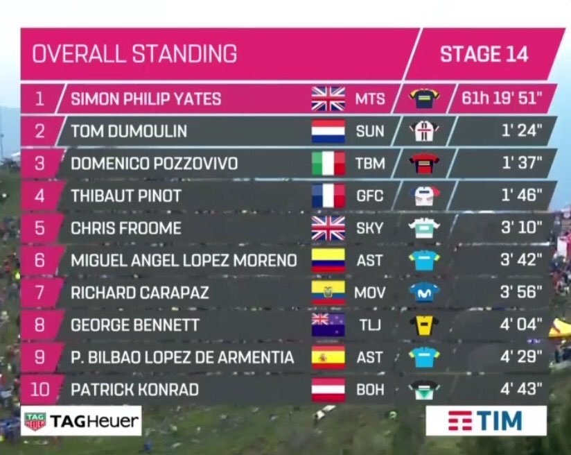 O britânico aparece finalmente na prova, arrecadando a etapa, mas continua a uma distância considerável de Simon Yates (terá de fazer um grande contra-relógio para reentrar na luta, mas o próprio Dumoulin já tem uma boa vantagem), que continua a um grande nível, sendo segundo e cada vez mais líder. Já Pinot teve um mau dia – Na 14.ª etapa do Giro, que terminou com a mítica subida ao Monte Zoncolan, Chris Froome (Sky) foi o vencedor do dia, atacando a cerca de 5 km do fim, após mais um grande trabalho de Poels (Sky), e chegando com seis segundos de vantagem sobre o compatriota Simon Yates (Scott), que aumentou a vantagem na liderança para Dumoulin (o holandês da Sunweb fez 5.º na etapa, perdendo 36 segundos, e está agora a 1’24”), Pozzovivo (1’37”) e Pinot (FDJ), que teve uma tarde infeliz, perdendo 42 segundos e caindo para a 4.ª posição da geral, a 1’46” da dianteira. Por outro lado, Miguel Ángel López (Astana) parece vir em crescendo e foi 4.º na etapa a 25 segundos de Froome, mas na geral é 6.º a 3’42”, atrás do líder da Sky, que é 5.º a 3’10”. Amanhã teremos nova etapa de montanha, com três subidas de 2.ª categoria e nova chegada em alto que colocará à prova os principais favoritos.