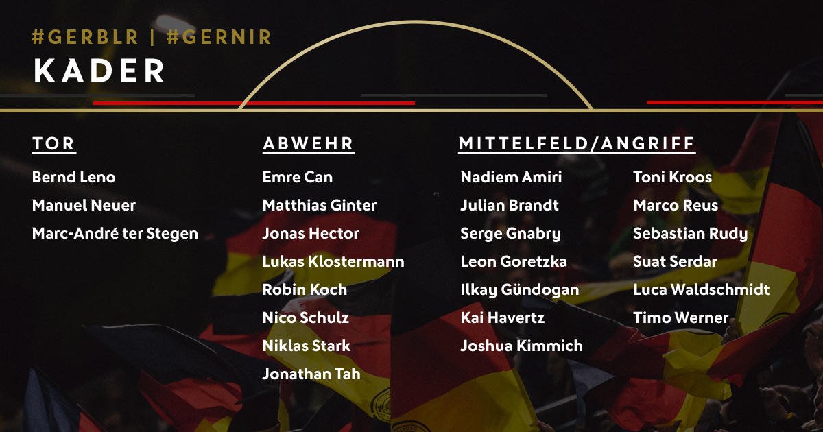Defesas: Emre Can (Juventus), Mathias Ginter (Mönchengladbach), Jonas Hector (Colonia), Likas Klostermann (RB Leipzig), Robin Koch (Freiburg), Nico Schulz (Dortmund), Niklas Stark (Hertha) e Tah (Leverkusen);
