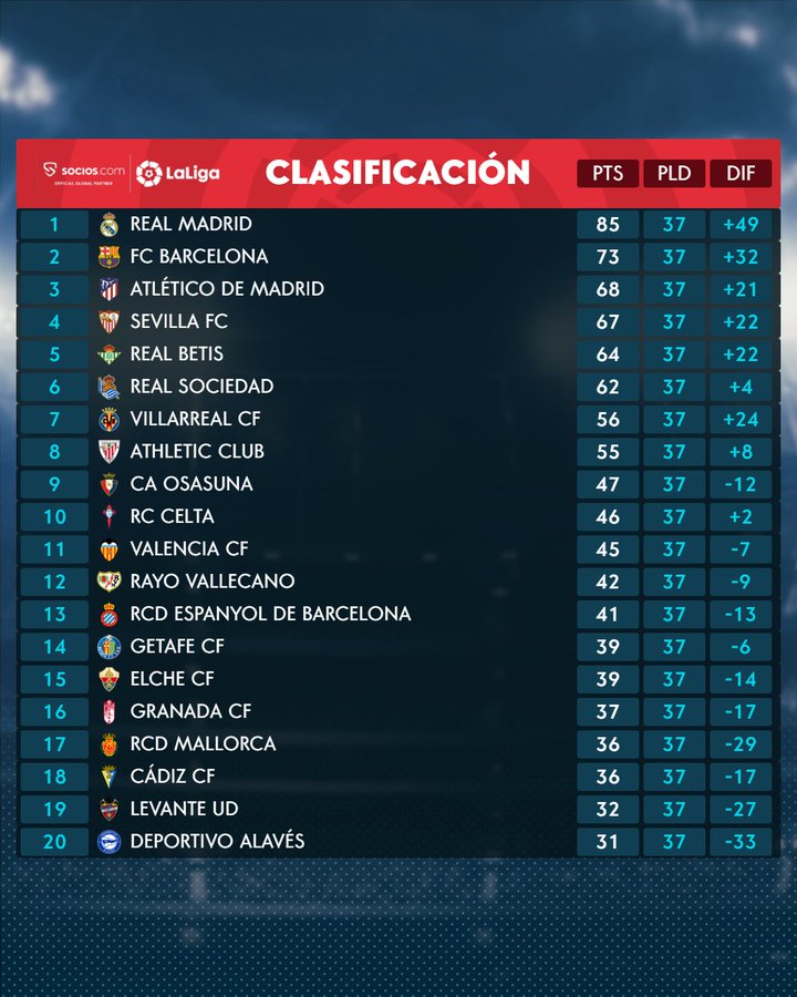 O Sevilla empatou com o Atlético Madrid e confirmou o apuramento para a Champions, juntando-se aos colchoneros, Real Madrid e Barcelona. Os resultados da 37.ª jornada da La Liga colocaram ainda o Bétis e a Real Sociedade na Liga Europa, ficando apenas saber se vai o Villarreal (56 pontos) ou o Athletic (55) à Conference League. Na parte debaixo da tabela, o Alavés perdeu e juntou-se ao Levante nas equipas despromovidas.