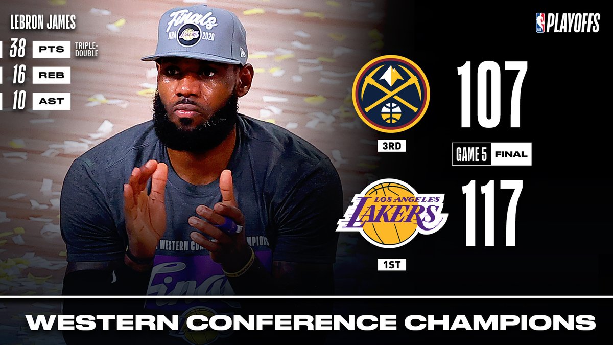 Está encontrado um dos finalistas da NBA de 2020! Os LA Lakers bateram os Denver Nuggets por 117-107 no jogo 5 da final da Conferência Este e regressam assim às finais da NBA, o que já não acontecia desde 2010. A formação de LA tomou o controlo da partida no 2.º período, ao intervalo já vencia por 10, e, apesar do equilíbrio no 3.º período, depois levou a melhor no último quarto. LeBron James fez uma partida monstruosa com 38 pontos, 16 ressaltos e 10 assistências (triplo-duplo). Anthony Davis também juntou mais 27 pontos, enquanto que Caruso (+/- de +16), Green e Howard combinaram para 31. Do lado de Denver, Jerami Grant foi a melhor unidade, com 20 pontos e 9 ressaltos. Jokic chegou também aos 20 pontos, mais 1 do que Murray.