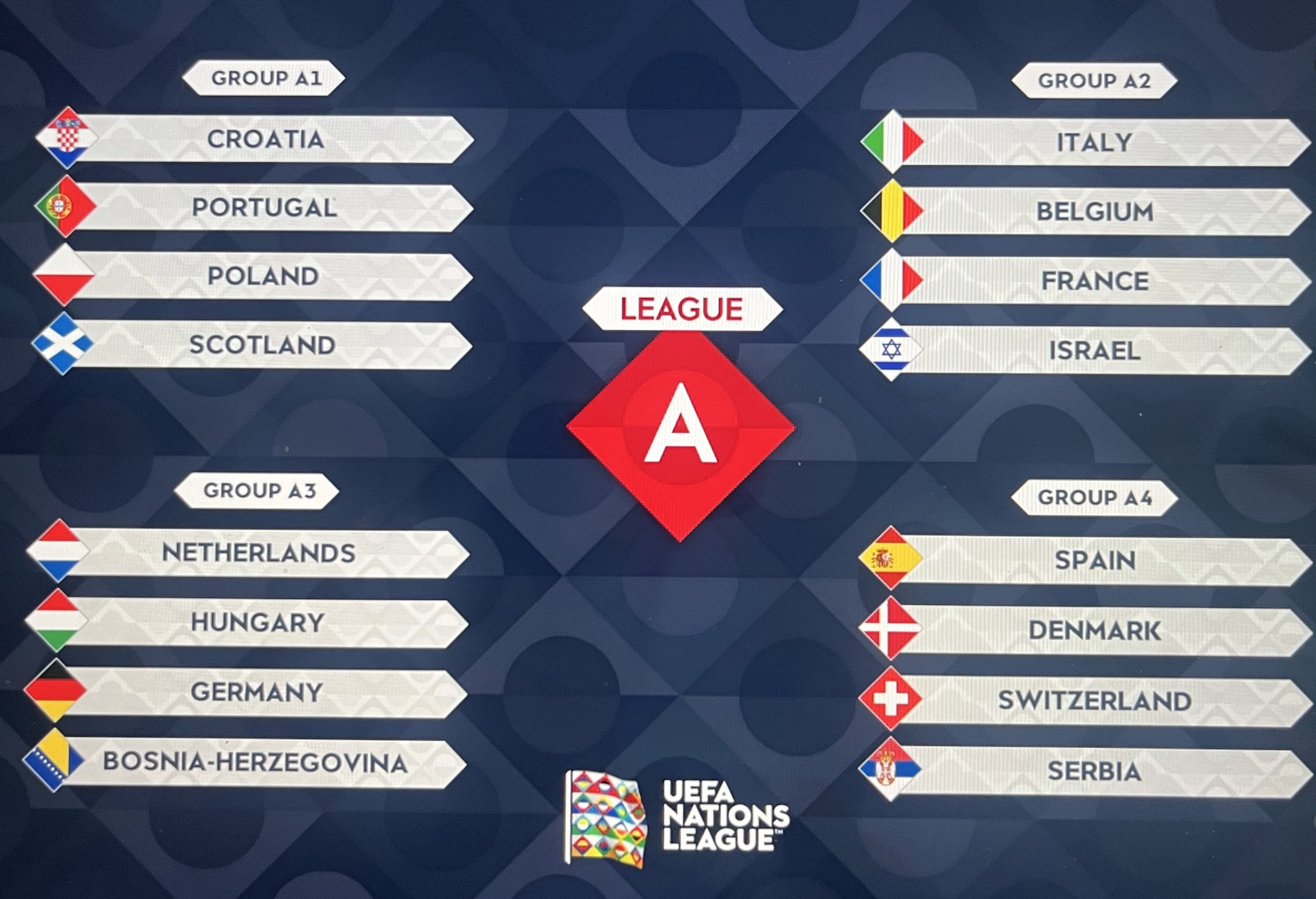 Portugal vai jogar na Liga das Nações com Croácia, Polónia e Escócia; Os lusos estavam no Pote 2, juntamente com Dinamarca, Bélgica e Hungria e ficaram colocados no Grupo 1, tendo evitado Itália, Países Baixos e Espanha no Pote 1 ou França e Alemanha do Pote 3. Recorde-se que nesta edição irá haver quartos-de-final, ao invés da habitual Final Four, pelo que passam os 2 primeiros de cada grupo.