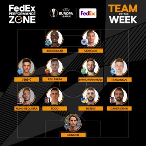 Bruno Fernandes, Aboubakar e Sequeira integram o XI ideal desta semana da Liga Europa. O médio do Sporting esteve em destaque na goleada por 4-0 sobre o PSV ao contribuir com dois golos e duas assistências, enquanto Aboubakar bisou na Suíça e garantiu a reviravolta que permitiu ao FC Porto somar os três pontos perante o Young Boys e manter-se na corrida pelo apuramento. Já Sequeira realizou duas assistências para os golos de André Horta e Fransérgio, autor do empate que valeu a passagem aos 16-avos da prova. XI semanal da Liga Europa: Sommer (B. Monchengladbach), Caner Erkin (Besiktas), Merkis (APOEL), Enzo Roco (Besiktas), Sequeira (SC Braga); Tsygankov (Dínamo Kiev), Bruno Fernandes (Sporting), Lorenzo Pellegrini (Roma), Verbic (Dínamo Kiev); Aboubakar (FC Porto), Morelos (Rangers).