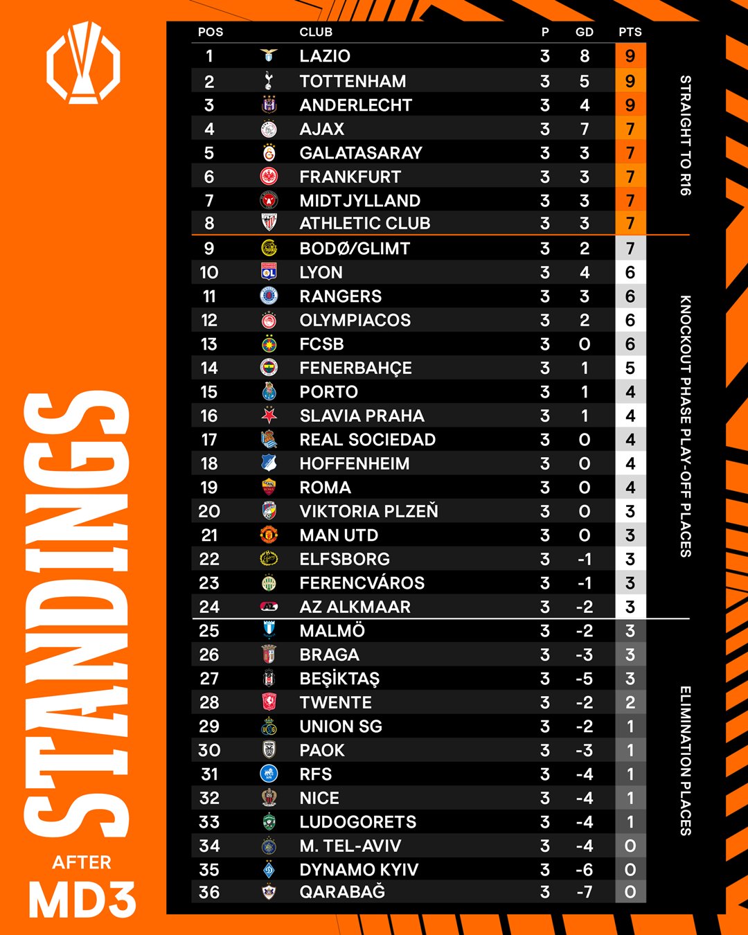 O FC Porto ocupa neste momento o 15.º lugar na Liga Europa ao fim de 3 jornadas. Os dragões estão assim em zona de play-off, mas apenas a 2 pontos do Top 8. Já o SC Braga é 26.º, lugar que não dá acesso à próxima fase. A tabela é liderada pela Lazio, que soma 9 pontos, os mesmos de Tottenham e Anderlecht. Ajax, Galatasaray, Eintracht, Midtjylland e Athletic completam o leque de equipas que neste momento está em zona de acesso direto aos oitavos-de-final.