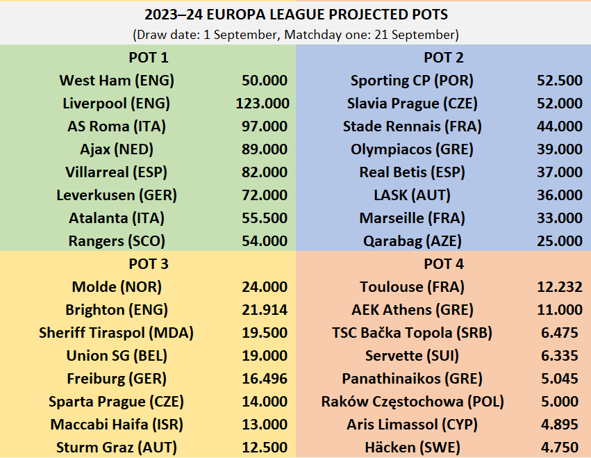 O Sporting vai estar no Pote 2 no sorteio da Liga Europa. Os leões, que precisavam que o Ajax fosse eliminado para chegar ao Pote 1, evitam assim o Slavia Praga, Rennes, Olympiacos, Bétis, LASK, Marselha e Qarabag. No entanto podem apanhar o West Ham, Liverpool, Roma, Ajax, Villarreal, Leverkusen, Atalanta e Rangers do 1.º Pote. Destaque ainda para a presença do Brighton no pote 3.