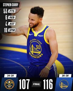 Stephen Curry tornou-se no melhor marcador na história dos Warriors, ultrapassando o lendário Wilt Chamberlain, ao marcar 53 pontos na vitória frente aos Nuggets. O PG, que no final do 3.º período já tinha 48 pontos e 10 triplos, somou o 3.º jogo da época com pelo menos 50 pontos, sendo que está numa sequência de 7 encontros seguidos com mais de 30 pontos. Nos outros jogos da noite, destaque para a derrota dos Lakers diante dos Knicks, por 96-111. Já Embiid só precisou de 26 minutos para apontar 36 pontos no triunfo dos 76ers contra os Mavs, por 113-95.