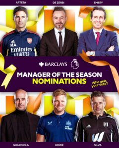 Se o Newcastle conseguir mesmo a ida à Champions, parece-me que ficaria bem entregue a Eddie Howe, no entanto, o Arsenal superou e muito a restante concorrência, de forma inesperada, e com um futebol vistoso, durante grande parte da época, pelo que será bem entregue a qualquer um dos dois.